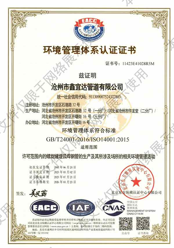 滄州市鑫宜達管道有限公司成立于2003年7月,坐落于滄州經(jīng)濟開發(fā)區(qū),占地面積40萬平方米,注冊資金1.81億元,是集螺旋鋼管生產、防腐加工以及無縫鋼管、卷板、帶鋼等品類鋼材經(jīng)營銷售于一體的工貿型企業(yè)。公司現(xiàn)有員工400多人,其中,中高級技術職稱的人員達120余名。 滄州市鑫宜達管道有限公司擁有9條螺旋鋼管生產線和3PE防腐生產線,可生產直徑219--3640mm,壁厚5.5--28mm,最高鋼級X100的各種規(guī)格防腐螺旋鋼管...
